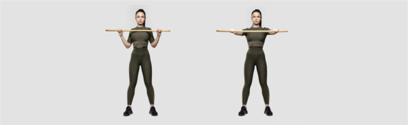 Исходное положение – стоя, ноги на ширине плеч, палку держим двумя руками за спиной на уровне таза. В исходном положении вдох и на выдохе палку поднимаем по спине до лопаток и вернулись в исходное положение. Выполнить 4—6 раз.