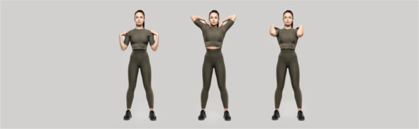 Исходное положение – стоя, руки согнуты перед грудью в локтевых суставах. В исходном положении – вдох, на выдохе локти отвели назад, свели лопатки, возвращаемся в исходное положение. Темп средний. Выполнить 4—6 раз. После выполнения упражнения расслабили руки и шею.