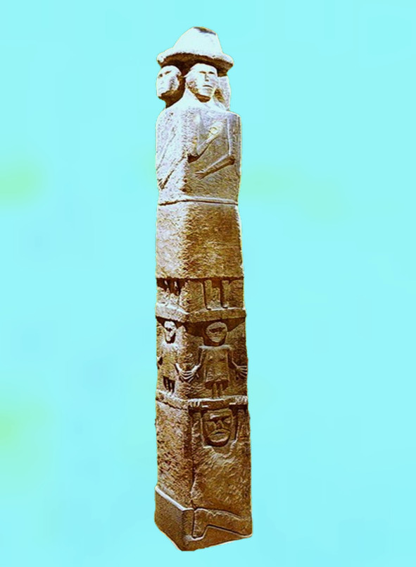 С каждой из четырёх сторон идола помещены различные изображения, главными из которых, видимо, являются лики в верхней части изваяния. С двух сторон высечены лица женщин, пол которых можно определить по наличию груди, а с двух других – мужские. Одна из женщин держит в руке кольцо, другая рог. Один из мужчин как бы опоясан саблей, под которой помещается изображение коня, второй мужчина при этом почему-то не получил каких-либо атрибутов. Ниже размещены ещё две женщины и двое мужчин, а ещё ниже четверо человекоподобных существ, которые будто бы держат на своих руках остальных героев рельефа.
