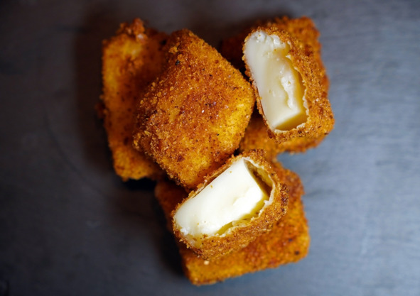 Дальше панировка и фритюр. Используем обычные панировочные сухари. Кусочки обваливаем в яйце, в муке, затем снова в яйце, в сухарях и отправляем во фритюр. Как только цвет сухарей поменялся, достаем – наше молоко поджарилось.