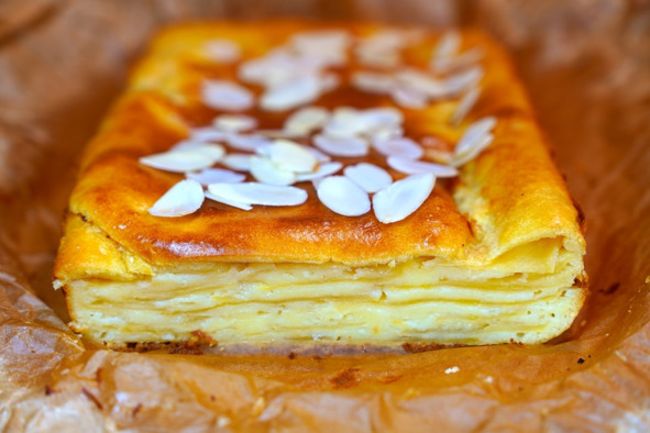 Ставим в духовку, разогретую до 180 градусов, на 40 минут. Не сразу, но пока корочка не сформировалась, посыпаем лепестками миндаля, сразу не надо, он сгорит.