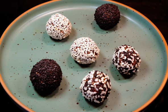 Все смешиваем и хорошенько перебиваем блендером, добавляем сок половины лайма, лепим шарики. Удобно лепить, смочив руки водой.