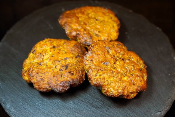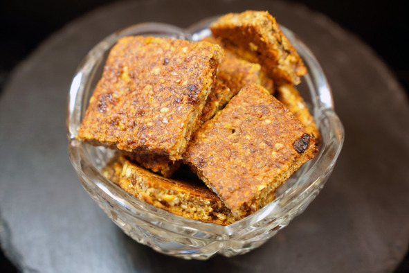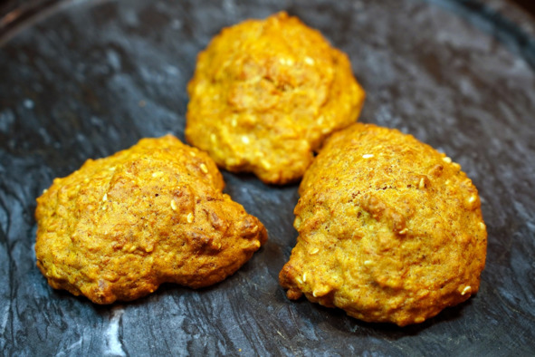 Тыкву натираем на мелкой терке, 200 граммов, 150 граммов муки, можно цельнозерновой, 50 граммов орехов, раздробленных, но не в пыль, сахар по вкусу, 1 яйцо, белый кунжут, корица, пекарский порошок, ваниль, соль.