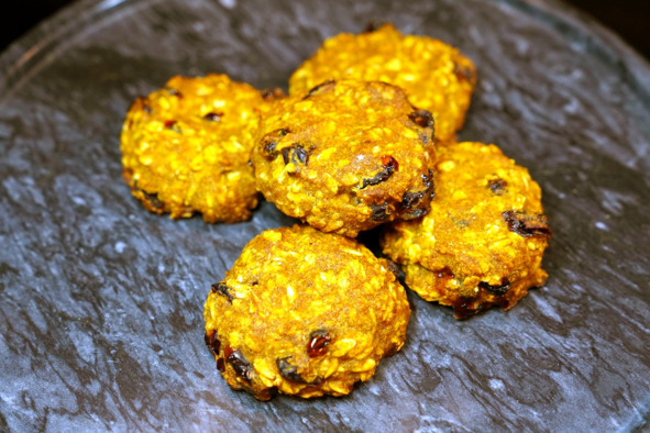 250 граммов тыквенного пюре, 100 граммов муки, 80 граммов овсянки, 50 граммов сливочного масла, сахар по вкусу, соль, корица, ваниль, разрыхлитель и сухофрукты, какие хотите и какие есть. У меня была клюква.
