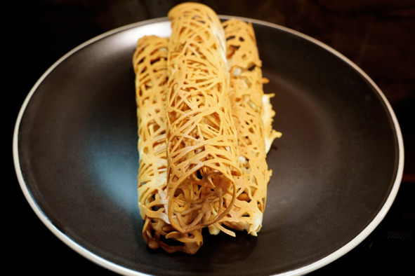 Тесто переливаем в кондитерский мешок с тонкой насадкой, разогреваем сковороду, наливаем растительное масло, щедро, и «рисуем» на ней этакую паутину с не очень большими ячейками. Когда тесто схватится достаточно, чтобы держать форму, берем лопатку, поддеваем и начинаем закручивать. Начать раньше – не будет трубочка круглой, сплющится под своим весом, начать позже – уже не свернется, треснет. Придется пробовать и приспосабливаться.