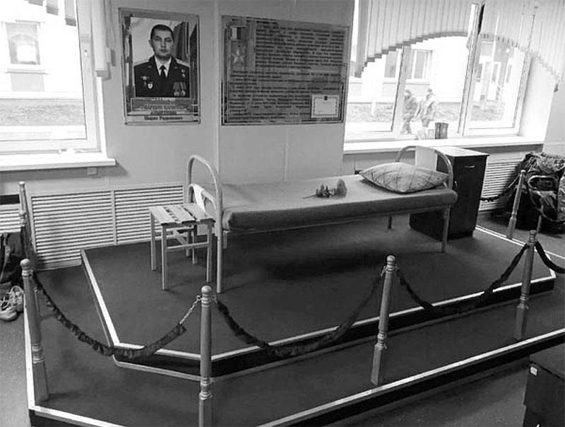 Героя чтят ежедневно. Он наш кадровый офицер части. Мне повезло, что я живу в расположении, где есть уголок, посвященный его памяти. У окна в середине расположения стоит на возвышении солдатская кровать с двумя гвозди ками, тумбочка.