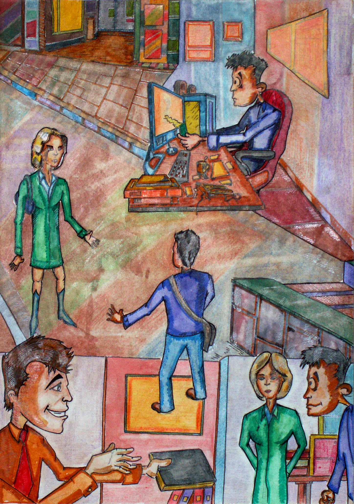 Штат фирмы был невелик – директор и пять операторов. Все сотрудники были землянами и свободно владели межгалактическим языком. Все документы велись на русском языке, но вся техника, включая факсы, принтеры и компьютеры, была изготовлена на планете Бертия, потому что только там производилось оборудование сразу на двух языках – межгалактическом и русском.