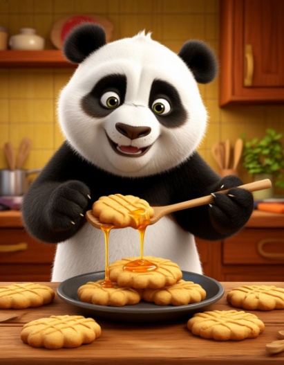 Пандыч с радостным урчанием схватил одно печенье и с наслаждением откусил. Хрустящая корочка, нежная бамбуковая начинка и сладкий, ароматный мед – это было настоящее блаженство! Его глазки закрылись от удовольствия, а по щекам потекли сладкие капли.