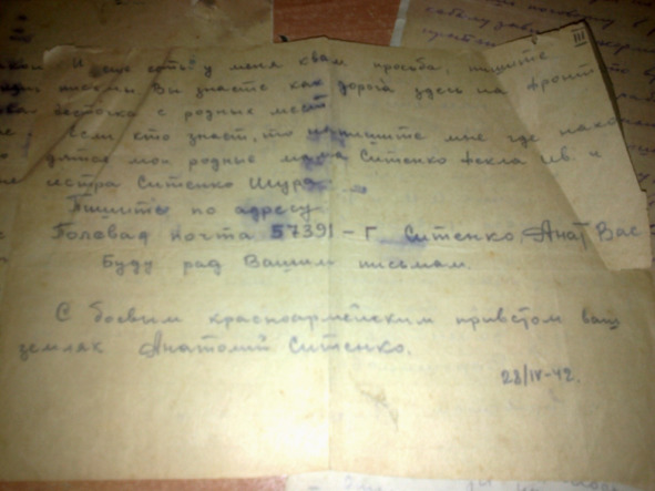 Пишите письма по адресу п/п 57391 – т. Ситенко Анатолию Васильевичу. Буду рад вашим письмам. С боевым красноармейским приветом ваш земляк Анатолий Ситенко. 28.4.1943 г.