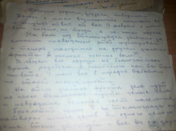 Теперь я имею возможность написать вам и получить ответ от вас. 13 февраля я послал вам письмо, но тогда я не имел адреса. Мы были под Сталинградом, успешно закончили ликвидацию этой группировки и теперь находимся на другом участке фронта. А сколько пленных было?!