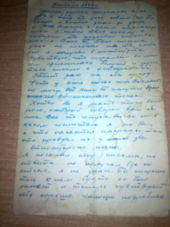 Шурочка, дорогая, признаюсь я не знаю тебя ты совсем не так какую я вообще знал до ухода в РККА. Знаешь, с каким наслаждением я читал твоё письмо, в котором ты подробно описываешь о Ване Т. Твои письма уже не похожи на те, которые я получал в институте. Чувствую, что морально во многом изменилась. Получил и другое твоё письмо с фотографией. Ответ даю на оба сразу. Фото у меня сейчас нет. Выслать не могу. От Нины Т. получил одно письмо. Ей посылаю тоже. Хотел бы я знать того военного, который говорил вам обо мне. Всё это чепуха. Нигде в госпитале я не был, а что касается награды, так это правда – их у меня две.