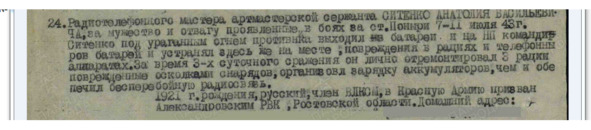 "24. Радиоэлектроннного мастера артмастерской Ситенко Анатолия Васильевича, за мужество и отвагу, проявленные в боях за ст.Поныри 7-11 июля 1943 г. Ситенко под ураганным огнём противника выходи из батареи и на НП командиров батарей и устранял здесь же на месте повреждения в рациях и телефонных аппаратах. За время 3-х суточного сражения он лично отремонтировал 3 рации, повреждённые осколками снарядов, организовал зарядку аккумуляторов, чем и обеспечил бесперебойную радиосвязь. "