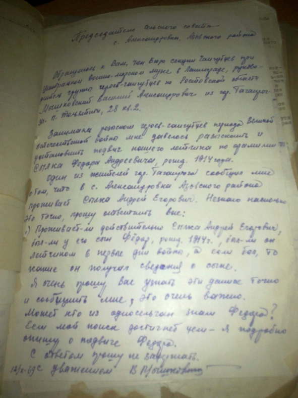 (Письмо из фондов школьного музея с. Александровка, коллекция Н.А.Мельника) «Председателю сельского совета с. Александровка Азовского района Обращаюсь к вам, член бюро секции Гангутцев при Центральном военно-морском музее в Ленинграде, руководитель группы героев-гангутцев по Ростовской области Мышковский Василий Александрович. Занимаясь розыском героев-гангутцев периода Великой Отечественной войны, мне удалось разыскать и установить подвиг нашего лётчика по фамилии Сылка Федора Андреевича, рожд. 1914 года. Один из жителей г. Таганрога сообщил мне о том, что в с. Александровка Азовского района проживает Сылка Андрей Егорович. Не знаю насколько это точно, прошу ответить мне: 1) Проживает ли действительно Андрей Егорович, был ли у него сын Федор, рожд.1914 г., был ли он лётчиком в первые дни войны, а если был, то когда он получал сведения о сыне Я очень прошу Вас узнать эти данные точно и сообщить мне, это очень важно. Может, кто из односельчан знал Фёдора? Если моё письмо достигнет цели – я подробно напишу о подвиге Федора. С ответом прошу не задерживать 12.10.1969 г. В. Мышковский