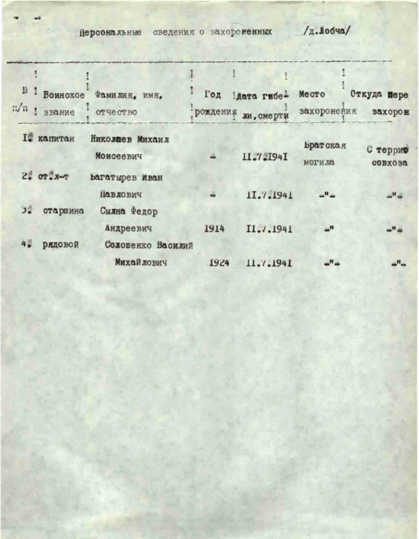 11.07.41 г. при выполнении боевого задания погиб экипаж Пе-2 из 60-го бап в составе: командир эскадрильи капитан М.М.Николаев, штурман эскадрильи ст. лейтенант И.П.Богатырев, стрелок-радист старшина Ф.А.Сылка. Похоронены в братской могиле, расположенной у деревни Лобча Чериковского района Могилевской области Республики Беларусь.
