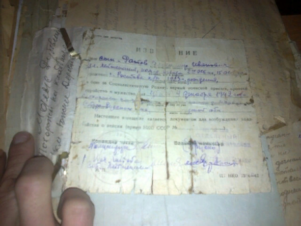 Последнее или одно из последних писем: «29.11.1942 г. Привет из части 210! Здравствуйте, дорогие папа, мама и братишка Женюк! В первых строках своего письма, писанного вами 19.10.1942 г., я получил, в котором получил долгожданные фотографии. Ваши фотографии и письмо с рисунками принесли мне много радости. Женя! За последний год ты очень сильно изменился. Твоё лицо перестало быть детским, каким я представлял его. До сегодняшнего дня мне часто представлялось твоё испуганное лицо, которое запало мне в память, это было, когда я с РПУ шёл на фронт и на Будёновском проспекте у цирка ты догнал наш строй. Когда я сказал, чтобы ты вернулся к маме, то твои нерешительные действия отстать или бежать за мной до сегодняшнего дня говорят о любви к брату и к матери. На фотографии ты сильно похудел, … [неразборчиво]…