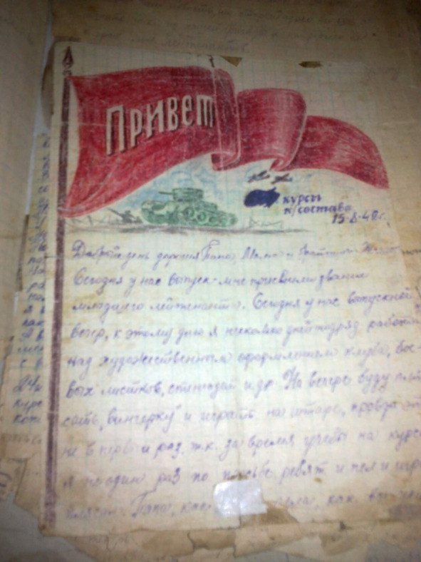 Теперь о себе. Чувствую себя прекрасно. Специальность свою уважаю, она из области радио. За это то я и награждён. Письма получаю от многих, это меня радует, что старые товарищи не забывают. Тебя интересует, кто подписывал адрес на конверте. Это мой товарищ и друг вроде .николая Покотило. Привет всем знакомым и родным, как здоровье мамы и вообще родных?