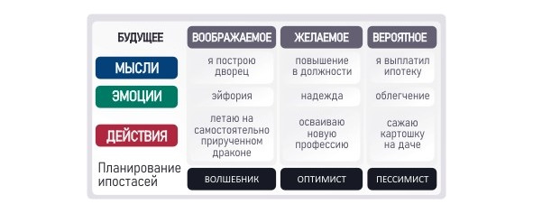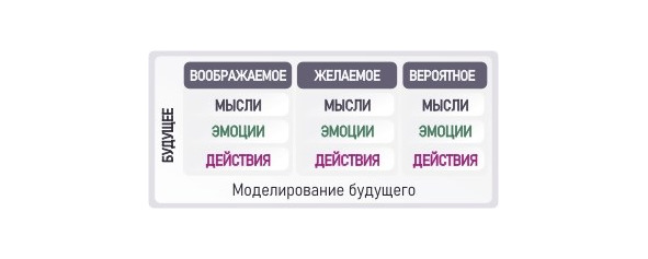 – «размещение» внимания в будущей реальности «вытаскивает» внимание из прошлых неудач и текущих проблем, улучшая текущее состояние;