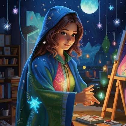 Потом Арина собрала все свои рисунки в тёплый плащ: голубой – для спокойствия, зелёный – для смелости, розовый – для доброты. Надев плащ, она почувствовала, как становится уютно и безопасно. В её мастерской заиграли звёзды-палитры, и каждая картина тихонько пела колыбельную.