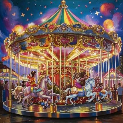 А однажды ночью, когда весь город уснул, старая карусель ожила. Лошадки тихонько заржали и закружились в волшебном танце, благодаря Аню и Мишу за то, что они вернули им жизнь и радость. И даже старый дуб, под которым стояла карусель, зашелестел листвой, словно рассказывая всем звёздам о настоящей детской дружбе, которая способна творить чудеса.