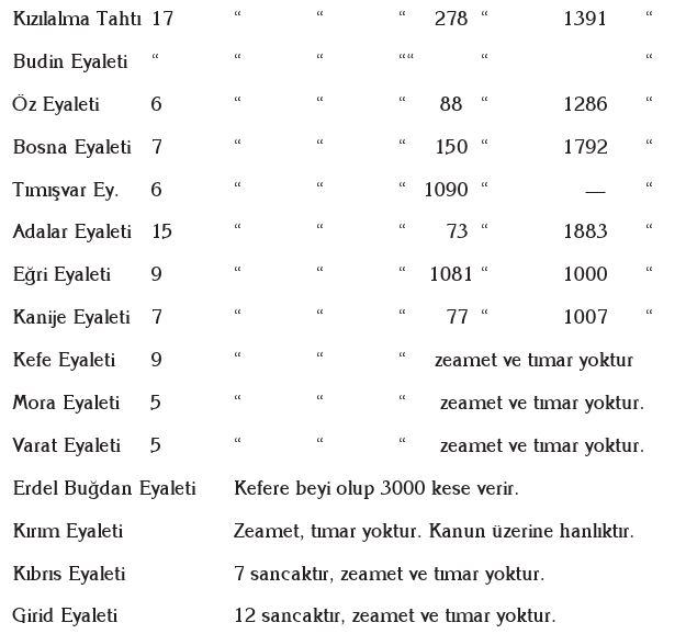 Yukarıda yazılmış olup usul ve âdetle idare olunan eyaletler insancakları 151 tanedir.113 Kılıç zeametleri 1571 tane,114 tımarları ise 41.286 tanedir.115 Kanun gereğince bu eyaletlerin cebelileriyle bütün askerine ve yıllık iltizamla idare olunan eyaletlerin vezirlerine ve askerine mahsus para verildikten sonra kalanı devlet kapısına gönderilir. Mısır, Habeş ve Bağdat geliri devlete gider. Tarablusşam ve Sayda eyaletleri dahi böyledir.