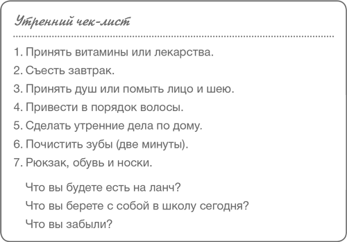 Первой проблемой, за которую они взялись, был утренний бедлам. Дэвид, который привык пользоваться информационной настенной доской на работе, предложил сделать такую дома. Семейство собралось вместе и составило утренний чек-лист, в котором было перечислено все, что дети должны успевать сделать до школы. Этот список повесили на стене в кухне. Он выглядел так: