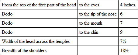 The head was long and flat, at the top; the forehead broad and high, but covered with hair to within an inch and a half of the eyebrow, which had scarcely any hair. The eyes were small, the nose was short, the mouth wide, and the lips thick. Neck short, and shoulders very broad. The arms were short, and wanting in muscle, as were also the thighs and legs. The body was long and large, and the breast broad and expanded. His height was nearly six feet.