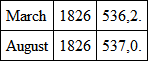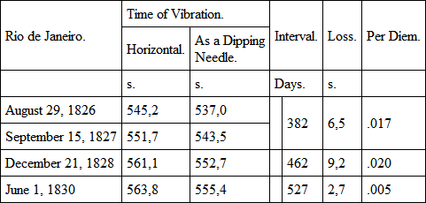 The dates of the observations at these three stations fall between the observations at Greenwich in March 1826, and those at Rio de Janeiro in August of the same year. Having the intensity at Greenwich = 1,372 and at Rio = 0,884, and the dip at Greenwich 69° 52′, and at Rio 14° 00, we have the time of vibration of Captain King's cylinder as a dipping needle at Rio at the respective dates as follows, namely,