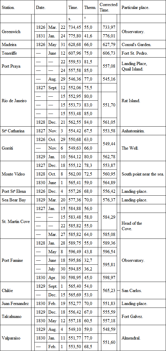 The corrections necessary to render the times of vibration at the different stations strictly comparable with each other, are as follows.