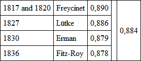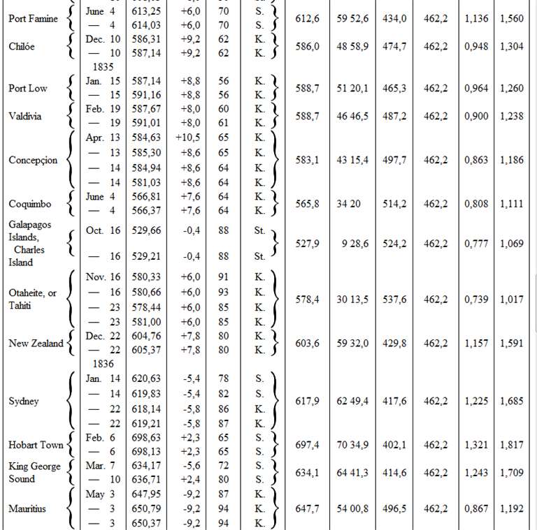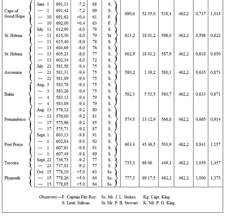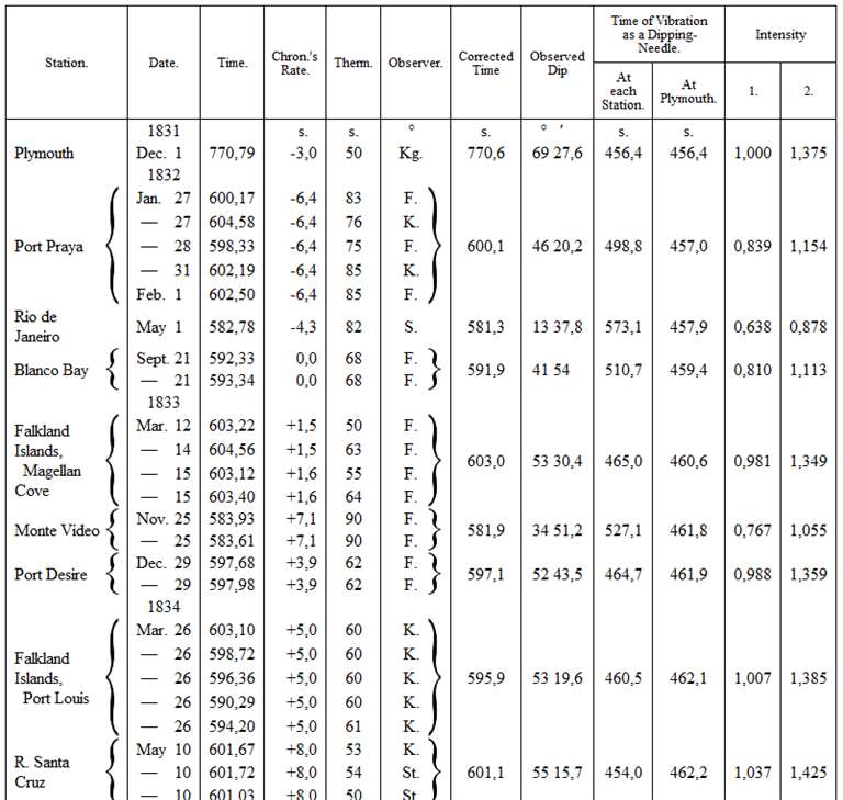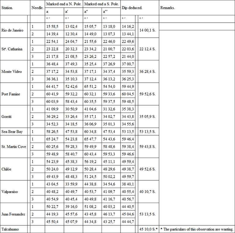 The dip observations of Captain King were communicated, in occasional correspondence during the voyage, to M. Hansteen, who computed them by Mayer's formula, and arranged them in a table, of which a copy was given by Captain King to Captain Fitz-Roy, and is printed in the next page. At some of the stations Captain Fitz-Roy also observed the dip in the subsequent voyage, and, as will be seen, the results of the two observers sometimes differ considerably. This may have been caused, either by instrumental or other error of observation, or by actual differences of dip existing in different localities at the same station.