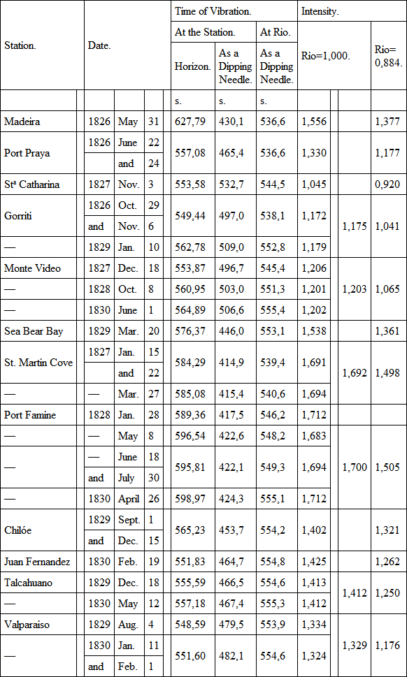 The second table contains the corrected times of horizontal vibration at each of the South American stations, at the dates respectively inserted, – the corresponding times as a dipping needle, – the times of vibration as a dipping needle at Rio de Janeiro at the same dates, derived from the observations in the first table, – and the resulting intensity at each station relatively to unity at Rio. Thus far the results are derived from Captain King's observations, unmixed with those of any other observer: but in order to bring Captain King's series into connexion with the general body of results of other observers, the values of his intensities are expressed in the final column in terms of the scale in common use, in which the force at Paris = 1,348, and at Rio de Janeiro 0,884; the latter being the mean of four independent determinations by the following observers, namely,