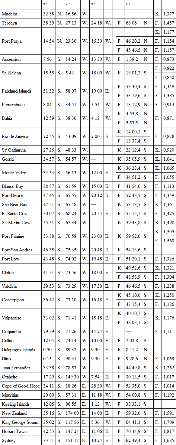 The subjoined table comprises the result of each observation, and the general results deduced for each station. The column entitled "Time" is that of 300 vibrations; and the "Corrected Time" is the mean of these, corrected for the rate of the chronometer and the arc, and reduced to an average temperature of 60°. The dips are those observed by Captain Fitz-Roy; except at Port Famine, where, as Captain Fitz-Roy did not observe, it has been supplied from Captain King's observations; and at Coquimbo, where, for the purpose of computing the intensity, it has been supplied by estimation from the other geographic positions on this coast, at which Captain Fitz-Roy observed the dip. In the column showing the time of vibration as a dipping-needle at Plymouth corresponding to the periods of observation at the several stations, the compensations have been introduced for the variation in the intensity of the cylinder, agreeably to what has been said above on that subject. The two final columns exhibit the values of the total magnetic intensity at the different stations derived from these observations. In the first of the two columns, the values are given relatively to the force at Plymouth, considered as unity; and in the second column, relatively to the force at Plymouth, expressed by 1.375; for the purpose of exhibiting Captain Fitz-Roy's results in direct comparison with the determinations of continental observers, who have taken Paris as their basis, giving the force at Paris the arbitrary expression of 1.3482. I have taken the ratio of the force at Plymouth to that at Paris to be as 1.375 to 1.348, which I believe will prove a very near approximation; it is that which results from Captain Fitz-Roy's observations at Plymouth, in October 1836 (page 17), and mine, at Tortington, in Sussex, in June 1837 (page 10): the dip at Tortington, at the period in question being 68° 57′, and the intensity, compared with Paris, through the medium of London, 1.368.