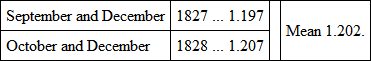 At Rio de Janeiro, which was the first station observed at in South America, the cylinder was vibrated in August 1826, September 1827, and December 1828; in the intervals between these dates are comprised the greater part of the observations on the east side of South America. There is no direct observation at Rio subsequently to December 1828; but we are enabled to supply the time of vibration, which would have been observed had the cylinder been employed at Rio on June 1, 1830, in the following manner. We have seen that on the 15th September 1827 the time of vibration was observed at Rio; on the 18th December following it was observed at Monte Video. These observations give the intensity at Monte Video relatively to that at Rio, subject to whatever change of magnetism the cylinder may have undergone in the interval of three months. This comparison was repeated in the following year, on Captain King's return from Monte Video to Rio, the interval being nearly of the same duration, and the order of the experiment reversed, the passage being in this instance from Monte Video to Rio, it having been before from Rio to Monte Video. On the supposition of an uniform, or nearly uniform rate of change in the cylinder, the errors arising therefrom during the two passages would be of opposite kinds, and should compensate each other in a mean of the two comparisons. Calling the force at Rio unity, these comparisons give its value at Monte Video respectively as follows, namely,
