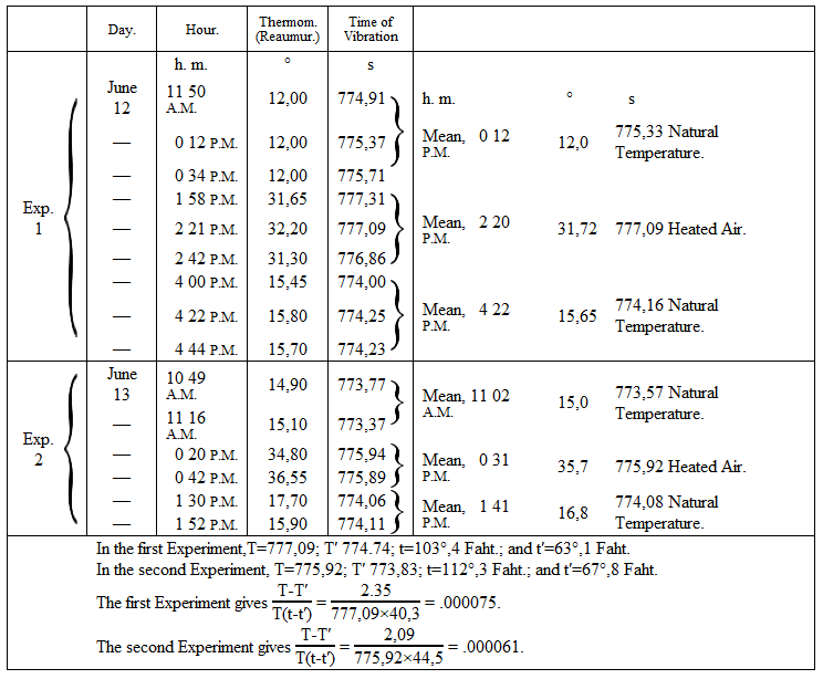 The correction for temperature for this cylinder not having been previously examined, I received it from Captain Fitz-Roy for that purpose, and made with it the following observations. The cylinder, in its own apparatus, was placed in a large earthen jar, glazed at the top, and standing in a larger earthen vessel, into which warm water could be poured at pleasure, and the cylinder was then vibrated alternately in heated air and in air of the natural temperature. These experiments were made at Tortington, in Sussex.