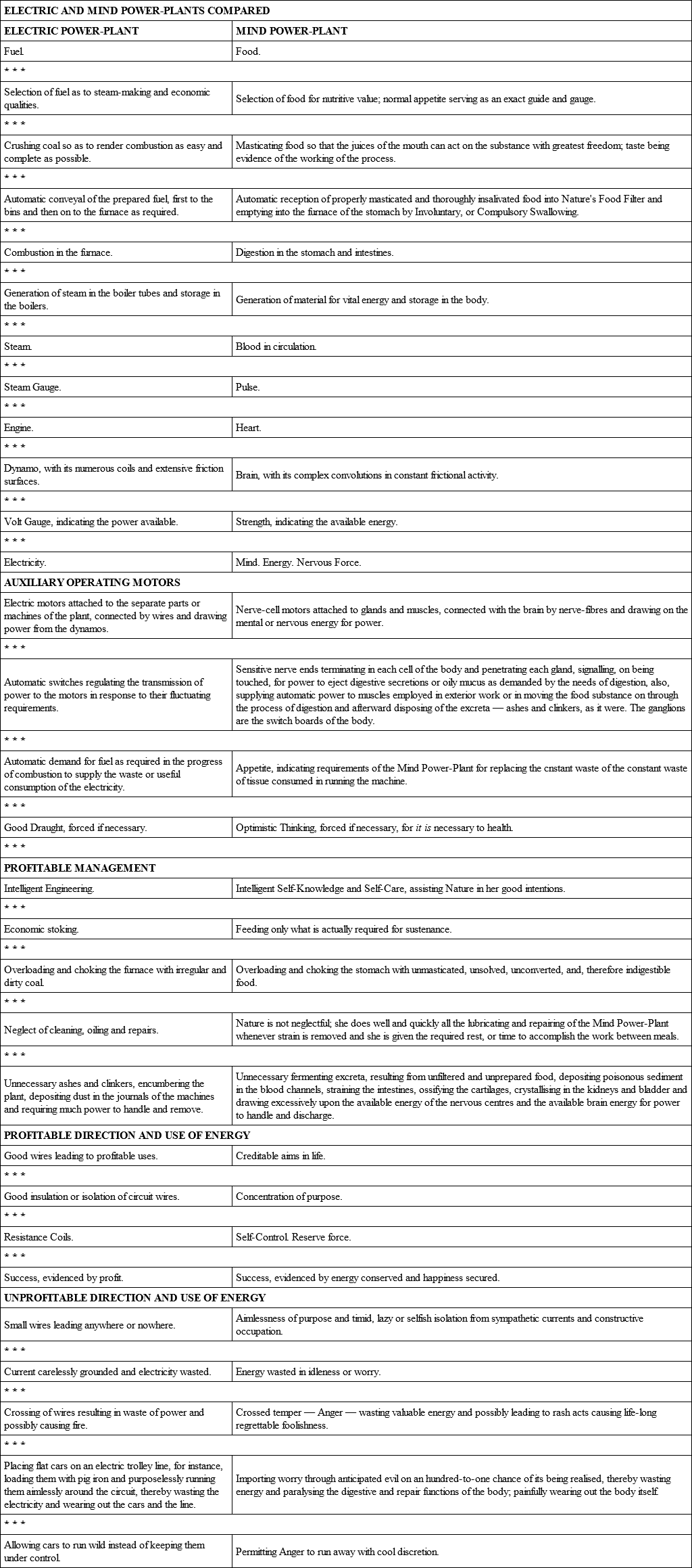 To those who are familiar with the modern electric power-plant the analogy between it and the human individual equipment, or Mind Power-Plant, seems very remarkable.