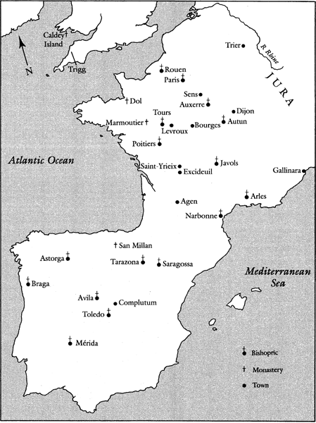 The interconnections of this clerical society are worth unravelling, if only because we shall repeatedly find in the course of this study that missionary churchmen, though sometimes loners, have tended to be sustained by a network of connections – kinsfolk, friends, patrons, associates in prayer – whose support was invaluable. Priscillian gained a following especially – and it became one of the counts against him – among pious aristocratic ladies. One such observer of his work is likely to have been the heiress Teresa, whose family estates seem to have lain in the region of Complutum (the modern Alcalá de Henares, near Madrid), a mere fifty miles from Avila. Teresa married the immensely rich, devout aristocrat Paulinus of Nola (who was connected to Ausonius). Paulinus knew Martin: he was the beneficiary of one of Martin’s miracles of healing by which the saint cured some sort of infection of the eye. Paulinus it was who introduced Sulpicius Severus to Martin. It is to Paulinus’ polite letter of congratulation that we owe our knowledge about the preaching of Victricius in the north-east of Gaul. Martin knew Victricius: we glimpse them together once at Chartres when Martin cured a girl of twelve who had been dumb from birth. (It would seem that Victricius was among the few Gallic bishops with whom Martin did not mind associating.) Martin also knew Priscillian and his work: he interceded with the Emperor Maximus on behalf of Priscillian when the latter had been found guilty of heresy.