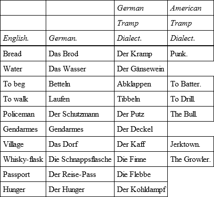 This vocabulary will give a fair idea of the dialect. It is much more complete than the American, affording, as it does, ample means whereby entire secrecy can be secured in public places. It is spoken by both Handwerksburschen and tramps, and it is my opinion that the former were not the originators, as is sometimes averred, but have rather acquired a fair knowledge of it by associating year after year, on the road, with beggars.