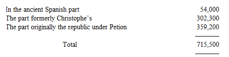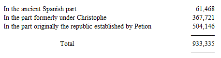 Now it must I think be admitted that such an increase as appears from a comparison of these two statements cannot be probable. That the population of any country should double in twenty-two years, cannot for a moment be believed. Here it is represented to have more than doubled, for there is a decrease in the Spanish part of nearly thirty-four thousand, and the subsequent war with Le Clerc and the massacres of Dessalines, as well as the long internal contests between Christophe and Petion, are not taken in the scale of decrease. The census of 1824, therefore, will, I should think, appear erroneous. That it is prima facie a fabrication, cannot be denied; and the advantage expected to result from this falsification I cannot comprehend. By the statement to which I have alluded as given to me, and on which I can rely as containing a more correct return of the population of 1824, Hayti appears to contain: —