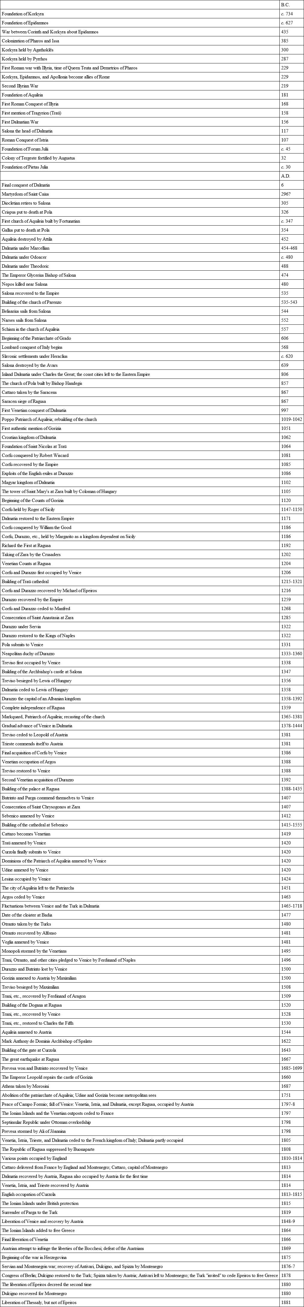 As there are in these papers a good many historical references, some of them to rather out-of-the-way matters, but matters which could not always be explained at length in the text, I have drawn up a chronological table of the chief events in the history of the lands and cities of which I have had to speak.