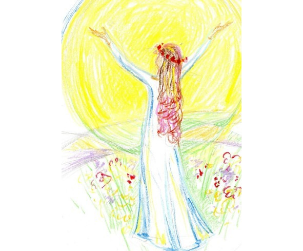 Бежит Василиса на говорливое журчание речушки, торопится. А как подбежала, обомлела. Светится водопад всеми цветами радуги. Водичка, прыгая с высоты каменного порога, играет – бурлит, вспыхивает ярким светом и, смеясь, журчит дальше. Так и манит, зовёт в игру. Сбросила Василисушка свои мрачные черные одежды, вошла в воду, играть с нею стала.