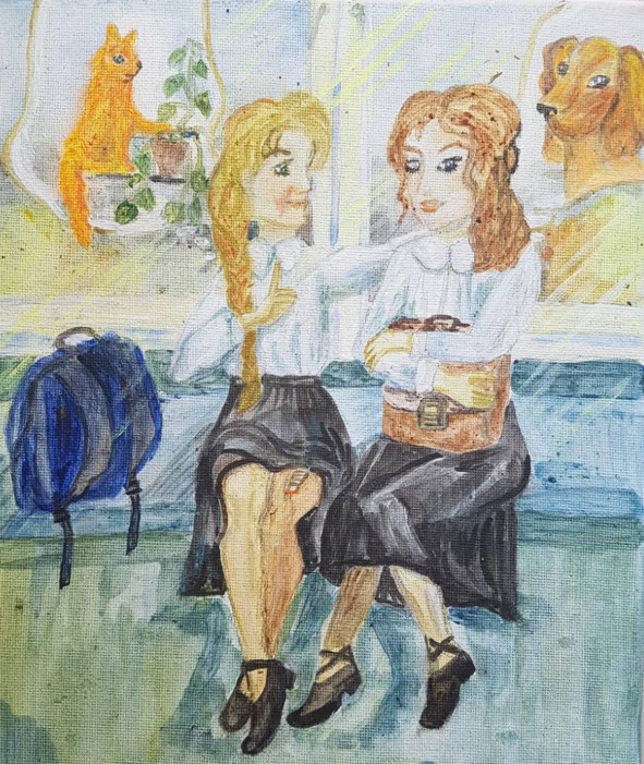 Подружились с Каролиной в сентябре позапрошлого года. Лина была новенькой в седьмом классе. В то утро я заметила «стрелку» у неё на колготках. Она кивнула, мол, уже в курсе. Зацепку сделал её пес, она перед школой гуляла с ним, она сразу же заметила дырку, но переодевать капроновые колготки не было времени – иначе она бы опоздала в школу… У нас в тот день болела учительница английского языка, и мы вместо урока почти целый час с нею сидели на подоконнике и обсуждали наших домашних животных. Показала ей свой секрет: у меня на капроновых колготках тоже дырка. Дырку эту еще неделю назад 1 сентября закрепила маминым лаком для ногтей и ношу «капрошки» в школу, дырка все равно прикрывается юбкой, которая до колена. Каролина рассказывала о своей собаке Голди, а я ей про своего кота Джинджера. Мы делились историями о своих животных, какие они проделки совершают и как похоже потом ведут себя… После того случая со стрелками на колготках мы всегда сидели рядом на всех уроках.