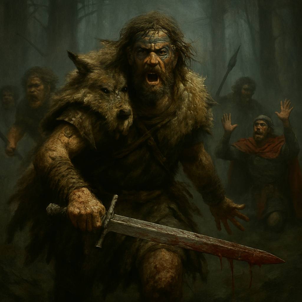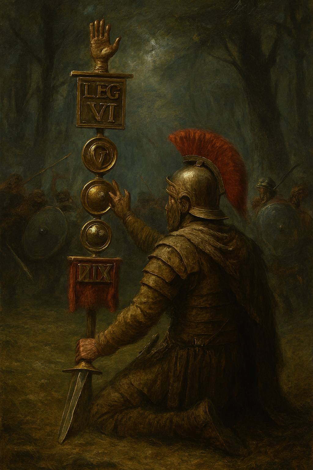 Перед ним мелькали искажённые болью лица товарищей и яростные гримасы варваров, чьи длинные волосы развевались, подобно чёрным знамёнам смерти. Бурая листва леса становилась багряной и липкой.