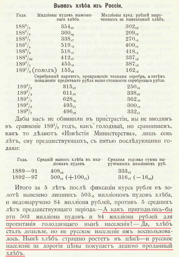 Англия, Франция, Германия, производя зерна менее 500 кг на душу населения, являлись его импортерами, а США, Канада, Аргентина, производя 800 – 1200 кг зерна на душу населения его экспортировали. И лишь Россия, производя менее 500 кг (норма самообеспечения производственным зерном) зерна на душу населения, вывозила его. То есть, экспорт шел за счет обречения части населения на недоедание и голод. Даже царские офицеры и генералы свидетельствовали, что 40% призывников в начале ХХ в. впервые в жизни ели мясо в армии.