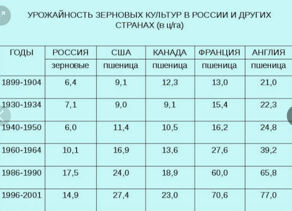 А теперь давайте посмотрим в таблице среднестатистическую урожайность в России и других странах мира. Она в полтора, в три с лишним раза меньше урожайности других стран. Урожайность зерновых в России была самой низкой в Европе.