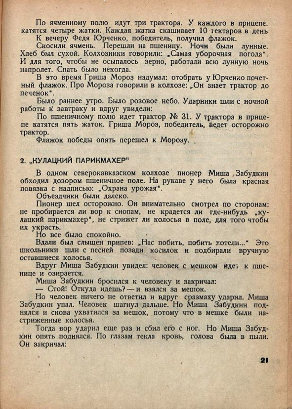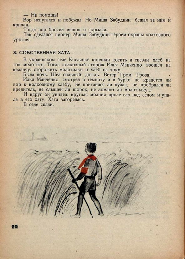 Пионер шел осторожно. Он внимательно смотрел по сторонам: не пробирается ли вор к снопам, не крадется ли где-нибудь «кулацкий парикмахер», не стрижет ли колосья в поле, для того чтобы