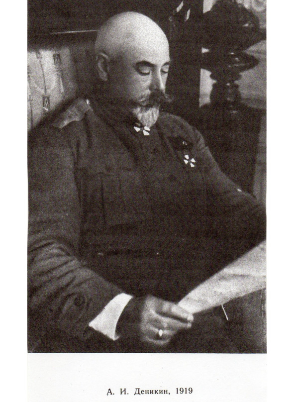 Деникин Антон Иванович в 1899г. окончил Военную академию и сделал карьеру пехотного офицера из провинции. Принимал участие в русско-японской войне, а затем в звании генерал-лейтенанта успешно командовал армиями Юго-Западного фронта во время Первой мировой войны. За боевые успехи Деникин был награжден Георгиевским оружием, орденами Св. Георгия 4-й и 3-й степени, а также Золотым Георгиевским оружием с бриллиантами. В январе 1919г. стал главнокомандующим Вооруженных сил Юга России (ВСЮР). Это был умный, честный, достойный уважения человек и истинный патриот своей страны.