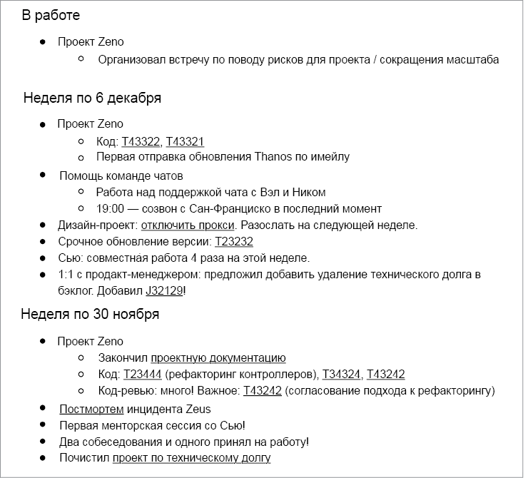 Вместо этого можно каждую неделю записывать ключевые достижения в своей работе, включая важные изменения, внесенные вами в код, код-ревью, проектную документацию, обсуждения и планирования, помощь коллегам, постмортемы инцидентов и все, что имеет значение. Бывший разработчик Stripe Джулия Эванс (Julia Evans) называет такой документ «список достижений»[10] (brag document)[11].