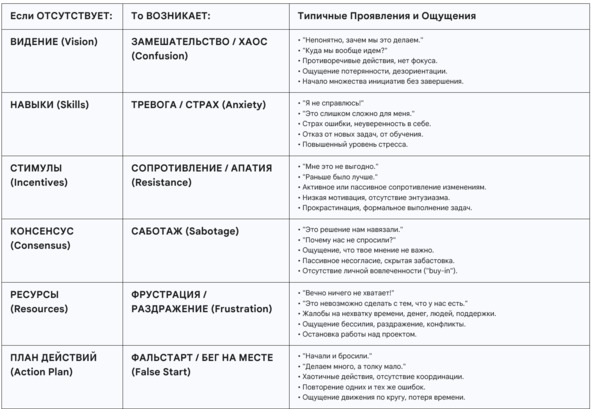 Модель Липпитт-Кностер не только описывает условия успеха, но и точно прогнозирует тип проблем, которые возникают при отсутствии каждого из элементов. Это делает ее бесценным диагностическим инструментом.