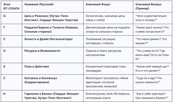 · Целостность (Голова + Сердце + Нутро/Тело): В отличие от чисто рациональных моделей, GT-COACH сознательно интегрирует эмоциональные и интуитивные аспекты (особенно на первом и седьмом этапах – G и H), что ведет к более аутентичным целям и устойчивым результатам.