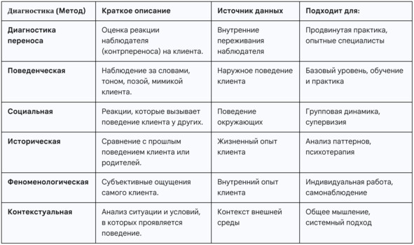 · Отличие от Социальной диагностики: Социальная диагностика фокусируется на наблюдаемой реакции другого человека (Как Петр отреагировал на слова Ивана?). Диагностика переноса фокусируется на внутренней реакции самого наблюдателя (Что я почувствовал (а), когда Иван это сказал? Какой импульс у меня возник?).