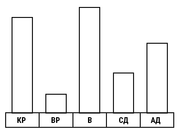 1. Подготовьте «холст»: Нарисуйте горизонтальную ось (ось X). Разделите ее на пять равных отрезков и подпишите их слева направо в следующем порядке: КР, ЗР, В, ЕД, АД. Это наши пять функциональных эго-состояний. Вертикальная ось (ось Y) будет представлять относительный уровень энергии или времени, вкладываемого в каждое состояние. Ее можно не размечать цифрами, так как важны именно относительные высоты столбиков.